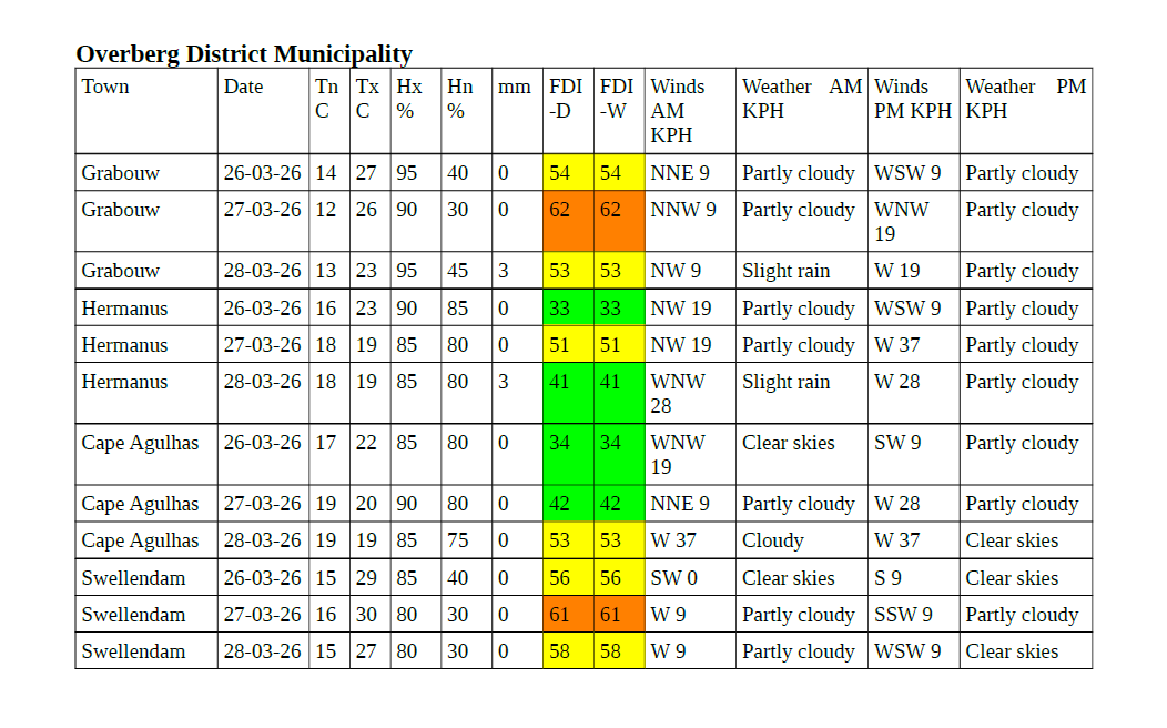 See the 3-day SAWS weather forecast for Grabouw, Hermanus, Cape Agulhas and Swellendam, including the Fire Danger Index per day here: